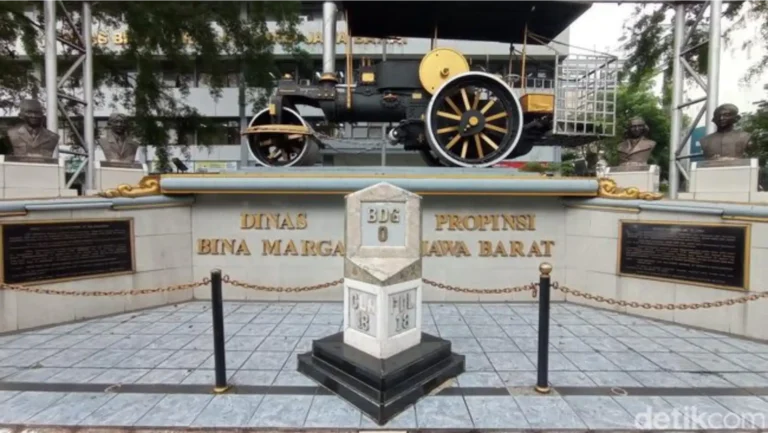 The date of the decree marked the birth of Bandung, and the place where Daendels’s cane was planted became the starting point of the city’s development, now known as Bandung’s zero kilometre point. The zero kilometre monument and the Stoomwals monument are dedicated to the thousands of West Javanese who were victims of force labour during the construction of the Jalan Raya Pos. The zero kilometre monument also replicas of the faces of Daendels, Regent Wiranatakusumah, Soekarno, and the Governor of West Java in 1945, Mas Soetardjo Kertohadikusumo.
